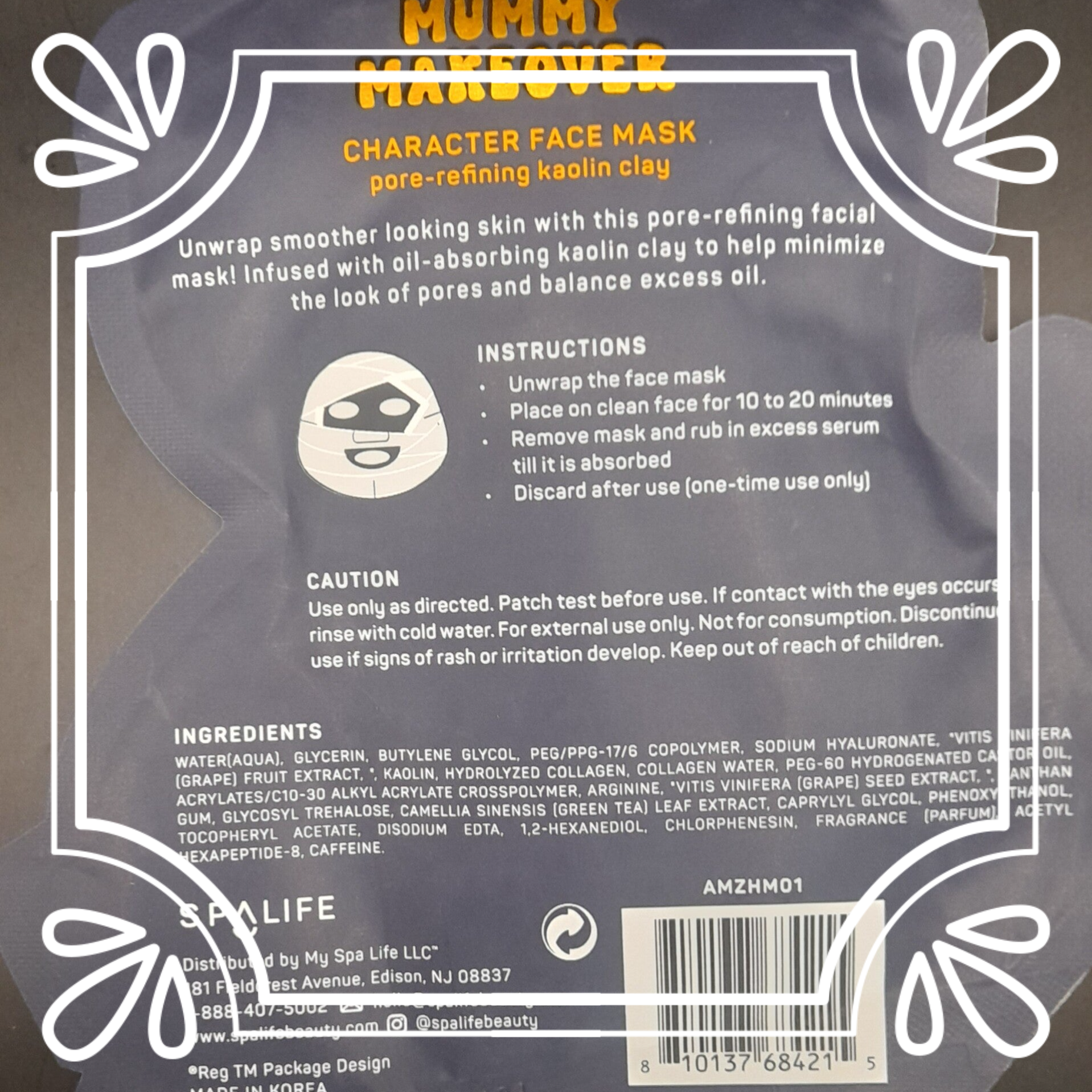MASQUE MUMMY MAKEOVER : Eau (Aqua), Glycérine, Butylène Glycol, Copolymère PEG/PPG-17/6, Hyaluronate de Sodium, "Extrait de Fruit de Vitis Vinifera (Raisin)", Kaolin, Collagène Hydrolysé, Eau de Collagène, Huile de Ricin Hydrogénée PEG-60, Acrylates/C10-30 Alkyl Acrylate Crosspolymère, Arginine, Gomme Xanthane, Glycosyl Tréhalose, Extrait de Feuille de Camellia Sinensis (Thé Vert), Caprylyl Glycol, Phénoxyéthanol, Acétate de Tocophéryle, Disodium EDTA, 1,2-Hexanediol, Chlorphénésine, Parfum (Fragrance), Acétyl Hexapeptide-8, Caféine. MASQUE CAT-TASTIC GLOW : Eau (Aqua), Glycérine, Méthylpropanediol, Copolymère PEG/PPG-17/6, Bétaïne, Huile de Ricin Hydrogénée PEG-60, Hyaluronate de Sodium, Extrait de Cendre Volcanique, Extrait de Charbon, Huile de Graine de Simmondsia Chinensis (Jojoba), Arginine, Carbomère, Phénoxyéthanol, Extrait de Fruit de Cucumis Sativus (Concombre), Gomme Xanthane, Allantoïne, Glycérèth-26, Acétate de Tocophéryle, Ethylhexylglycérine, Acide Lactique, Huile de Graine de Macadamia Ternifolia, Disodium EDTA, 1,2-Hexanediol, Huile de Zeste de Citrus Reticulata (Mandarine), Huile de Graine de Limnanthes Alba (Ecume des prés), Huile de Noyau de Prunus Armenica (Abricot), Extrait de Fruit de Rubus Fruticosus (Mûre), Chlorphénésine, Caféine, Parfum (Parfum). MASQUE HOCUS GLOW-CUS : Eau (Aqua), Glycérine, Butylène Glycol, Copolymère PEG/PPG-17/6, Niacinamide, Bétaïne, Arbutine, Hyaluronate de Sodium, Huile de Ricin Hydrogénée PEG-60, Acrylates/C10-30 Alkyl Acrylate Crosspolymère, Allantoïne, Gomme Xanthane, Glycosyl Tréhalose, Eau de Hamamelis Virginiana (Hamamélis), Caprylyl Glycol, Phénoxyéthanol, Acétate de Tocophéryle, Disodium EDTA, 1,2-Hexanediol, Extrait de Citrus Reticulata (Mandarine), Extrait de Graine de Citrus Aurantium Dulcis (Orange), Chlorphénésine, Parfum (Parfum).